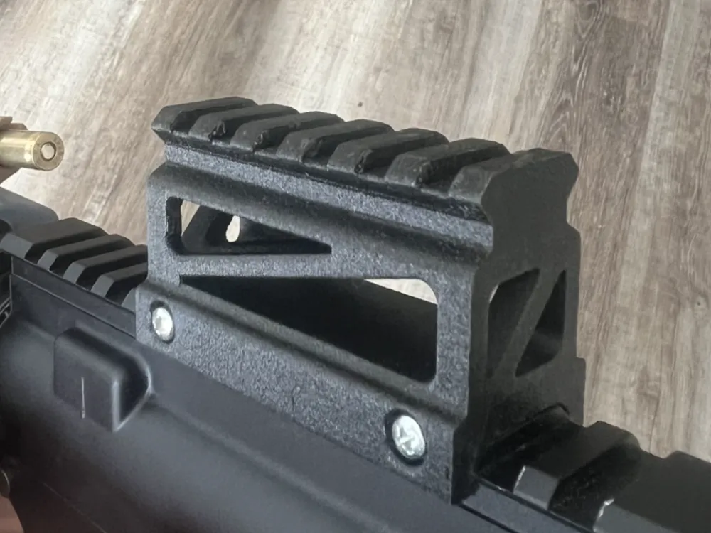 Este modelo apresenta um elevador de mira projetado para ser montado em trilhos Picatinny.